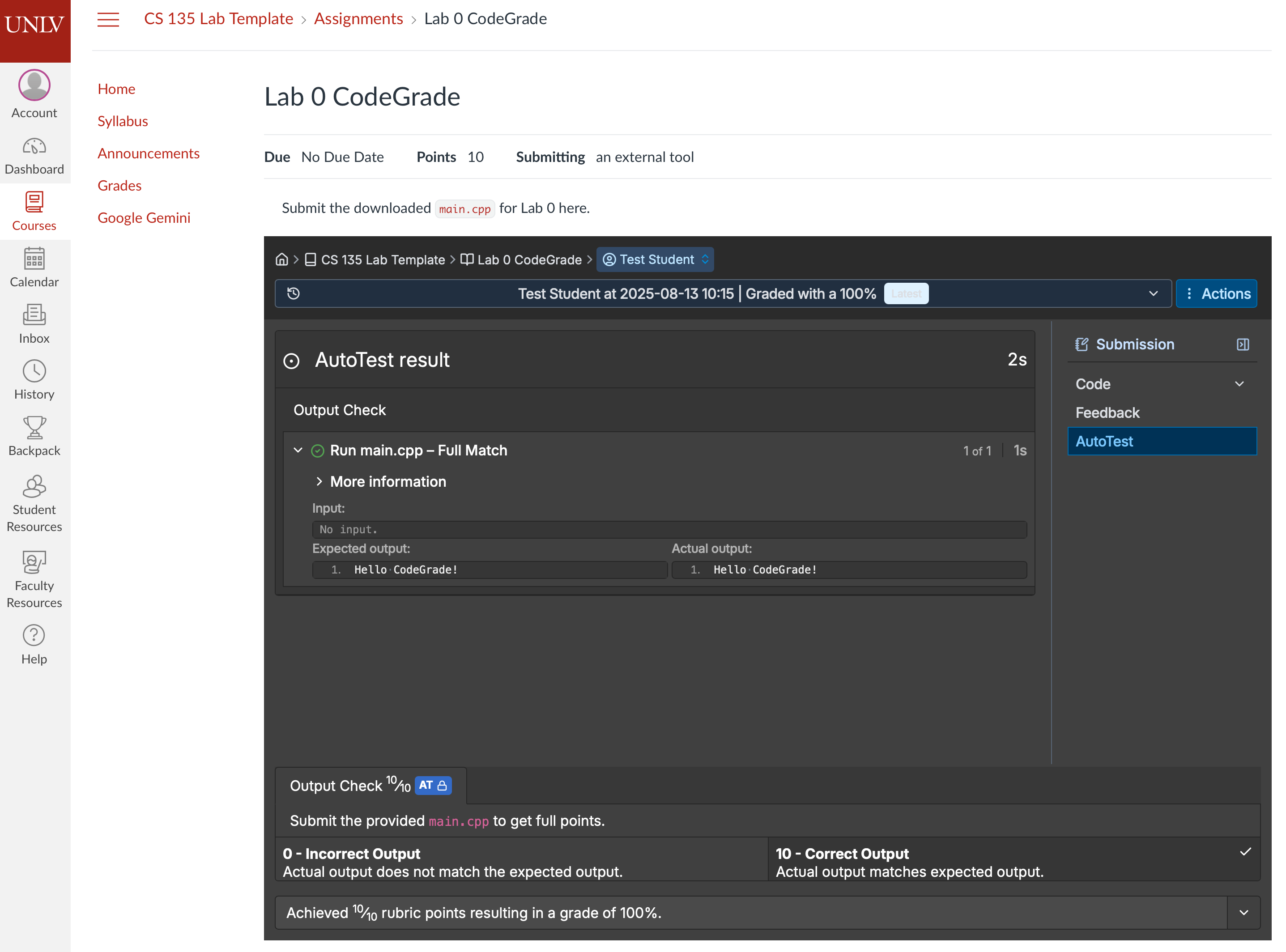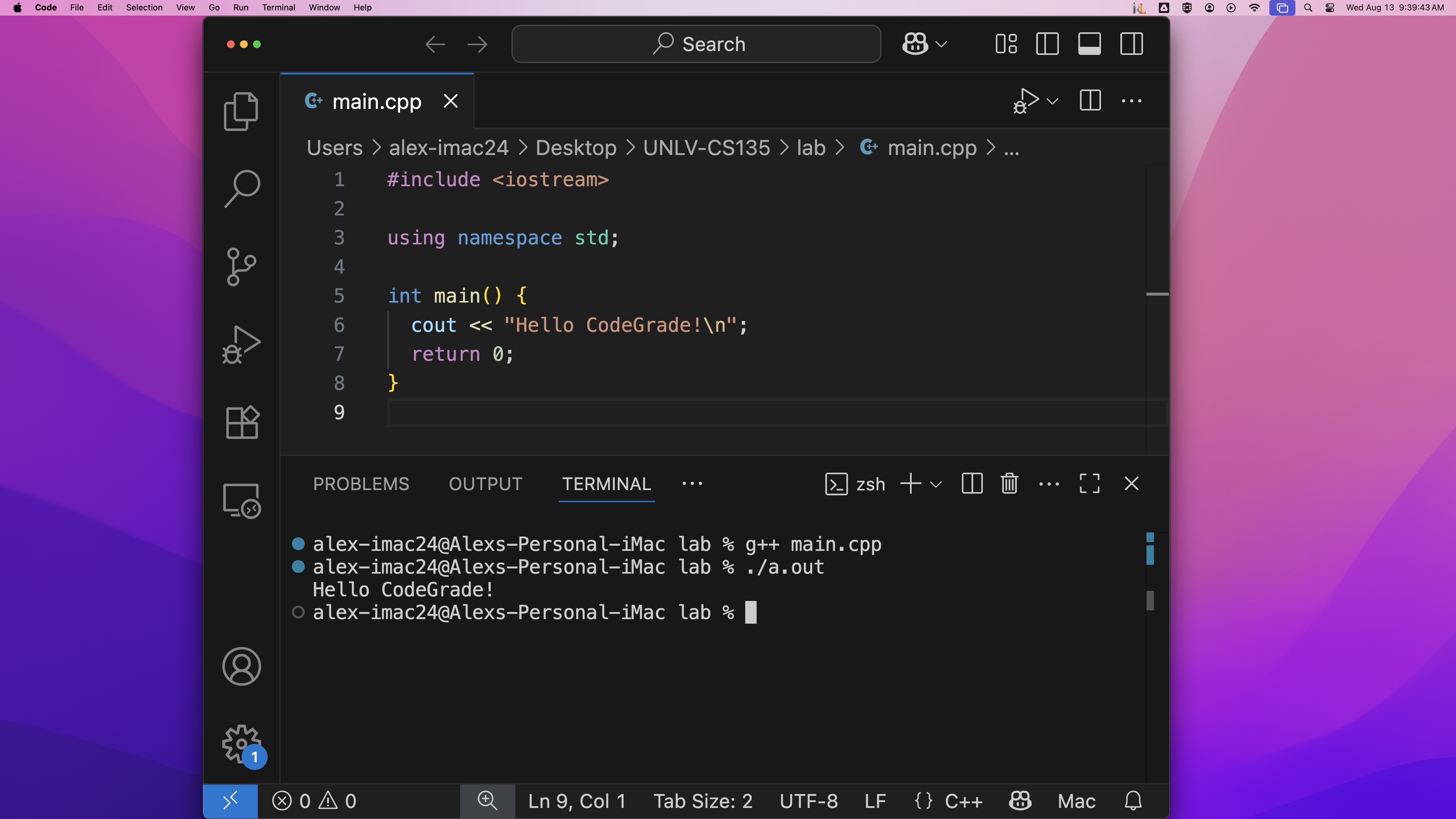 Open Lab 0 CodeGrade via Canvas and upload the main.cpp